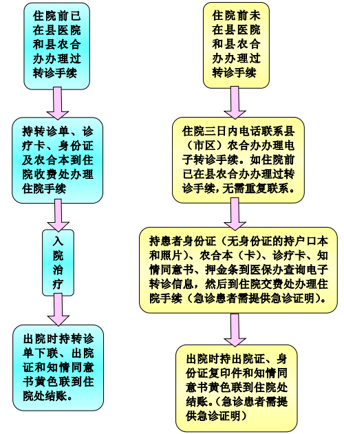 4、未办理《转诊、转院审批表》的农合患者,在住院证右上角位置标明农合,按自费病人程序办理入院手续。